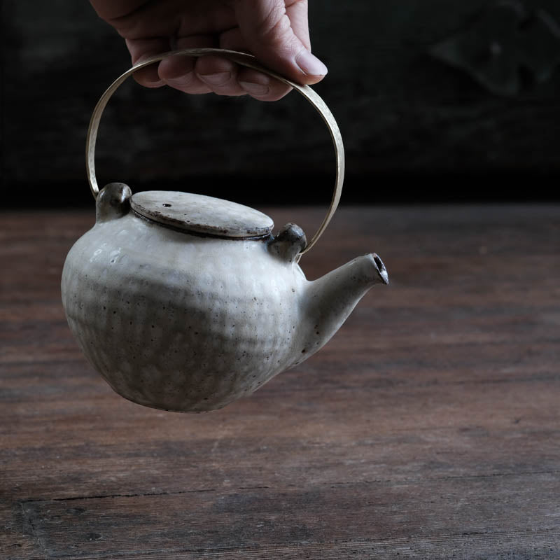 The handles were formed using pure brass stock (lead free), shaped by hammering and fit to each teapot individually to ensure a tight fit.